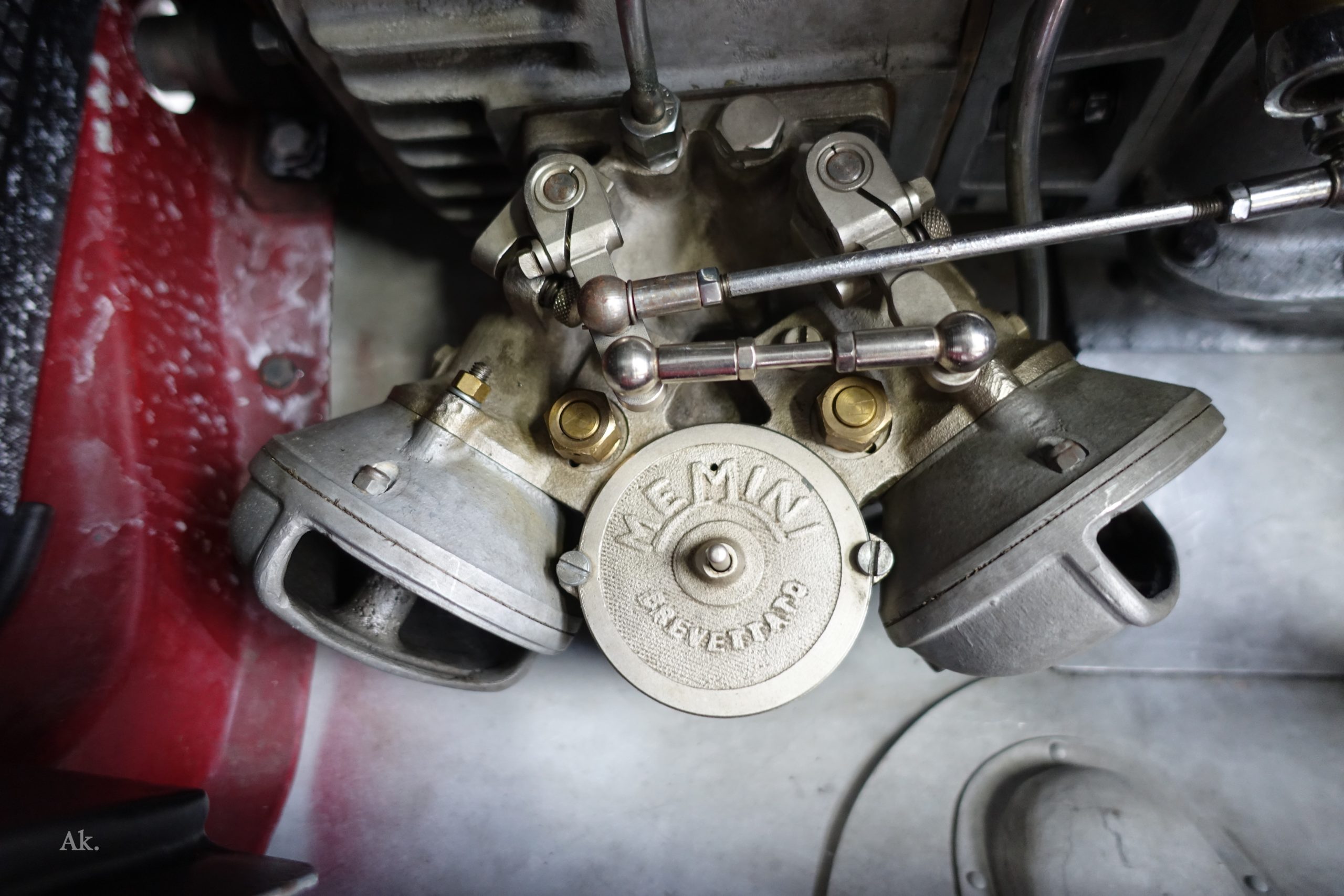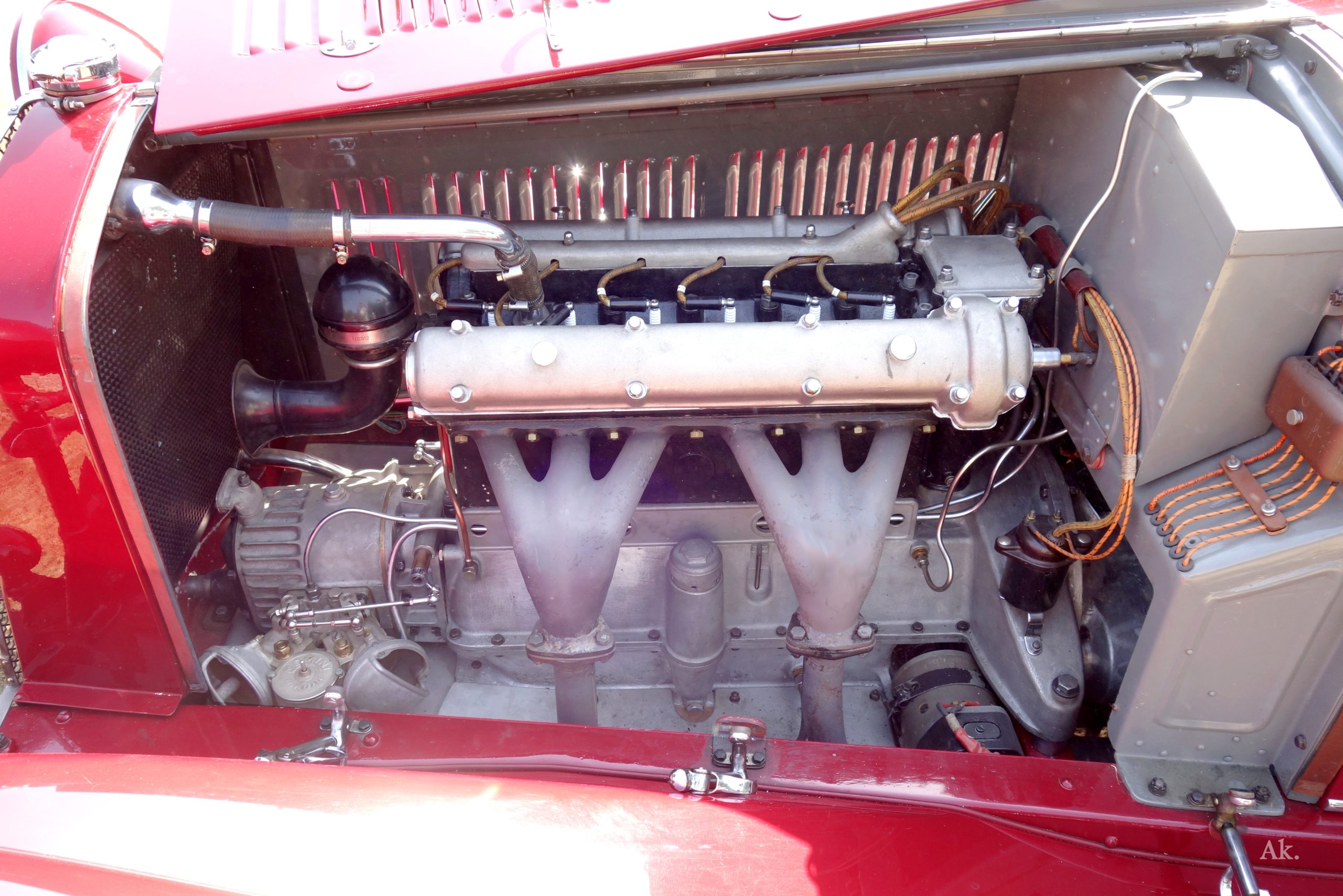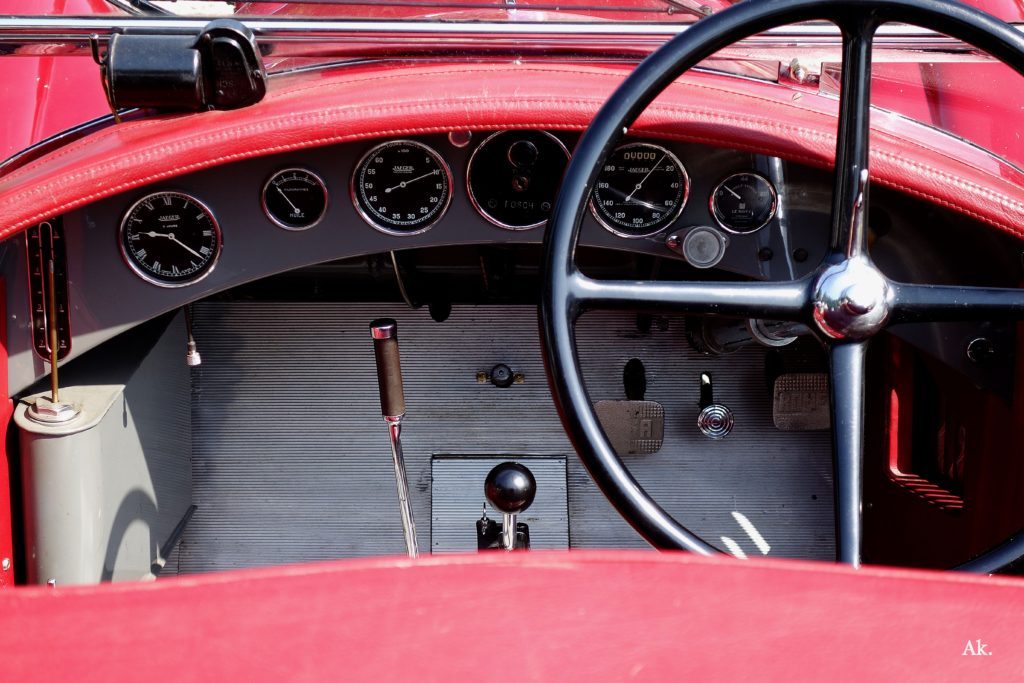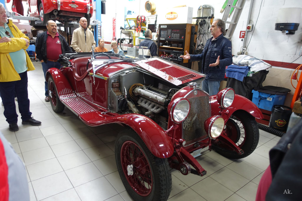 Après une présentation de l’historique de cette voiture par son propriétaire, José Resende et moi-même avons échangé quelques mots sur la technique, carburateurs Memini, compresseur à lobes de type Roots, amortisseur à disques.